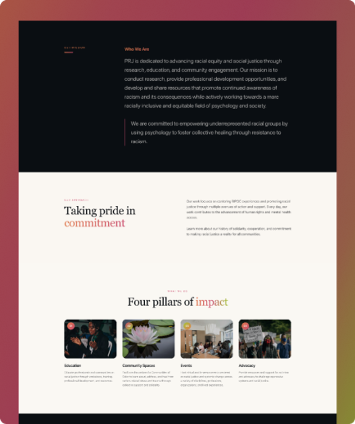 We structured the site around PRJ's four pillars of impact (Education, Community Spaces, Events, and Advocacy) giving each pillar visual weight and narrative space. The design language is intentionally warm and grounded, using community-centered photography and a layout that guides visitors from understanding the mission to taking action, whether that's donating, registering for the upcoming "Healing While Harmed" conference, or reaching out to get involved.