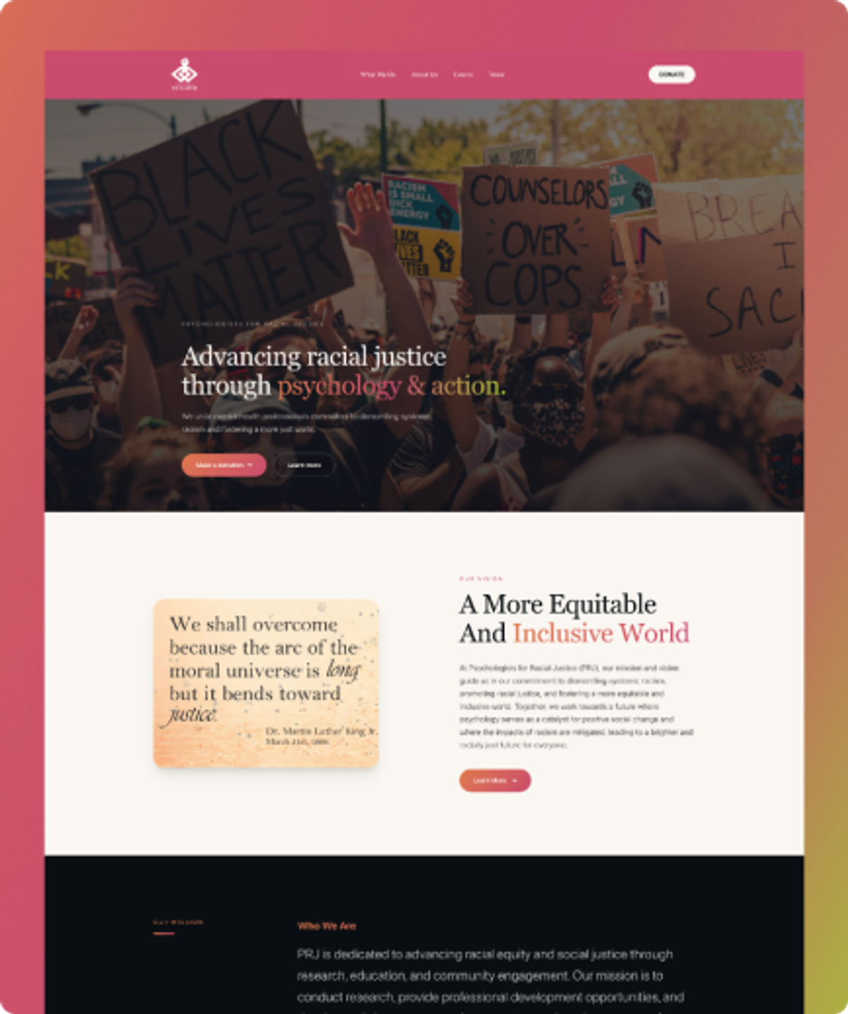 Psychologists for Racial Justice (PRJ) is a nonprofit organization uniting mental health professionals committed to dismantling systemic racism through research, education, community healing, and advocacy. Founded by a team of PhDs and clinical practitioners, PRJ needed a digital presence that matched the gravity and urgency of their mission. They needed a platform that could serve as both a public-facing hub and an operational tool for events, continuing education, and community engagement.